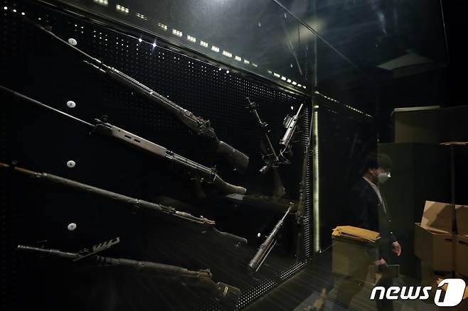 (서울=뉴스1) 황기선 기자 = 30일 서울 용산구 전쟁기념관에서 열린 '기밀해제-국군정보사령부 총기를 보다' 특별전에 총기류가 진열돼 있다.