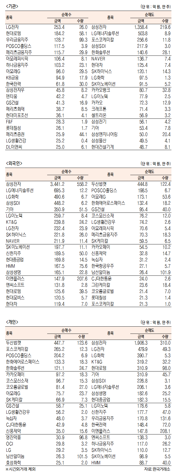 ◇기관·외국인 순매수 주요 종목=LG전자(066570)삼성전자(005930)현대로템(064350)LG에너지솔루션(373220)우리금융지주(316140)LG화학(051910)POSCO홀딩스(005490)삼성SDI(006400)메리츠금융지주(138040)기아(000270)아모레퍼시픽(090430)LG이노텍(011070)하나금융지주(086790)KT&G(033780)아모레G(002790)KB금융(105560)SK하이닉스(000660)한국전력(015760)NAVER(035420)