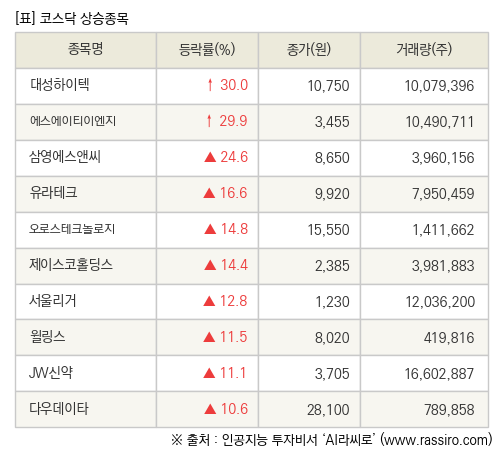 [fnRASSI]장마감, 코스닥 상승 종목(대성하이텍 30.0% ↑)
