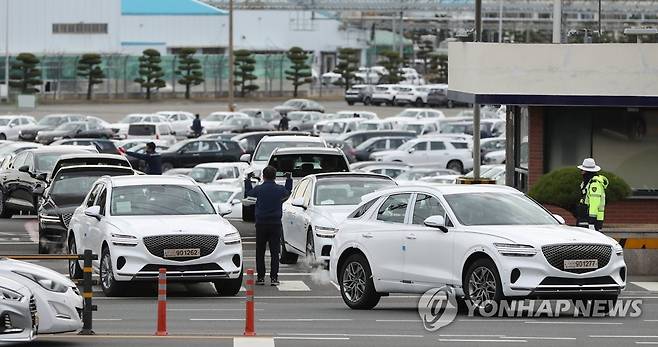 (울산=연합뉴스) 김용태 기자 = 30일 오후 울산시 북구 현대자동차 울산공장에서 임시번호판을 단 완성차가 빠져나오고 있다. 현대차는 화물연대 파업으로 완성차 탁송차량(카캐리어) 대부분이 운행을 멈추자 직원들이 직접 차를 몰아 옮기는 '로드 탁송'을 하고 있다. 2022.11.30