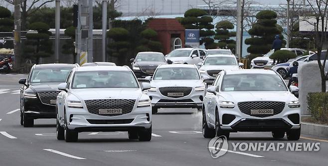 (울산=연합뉴스) 김용태 기자 = 30일 오후 울산시 북구 현대자동차 울산공장에서 임시번호판을 단 완성차가 빠져나오고 있다. 현대차는 화물연대 파업으로 완성차 탁송차량(카캐리어) 대부분이 운행을 멈추자 직원들이 직접 차를 몰아 옮기는 '로드 탁송'을 하고 있다. 2022.11.30