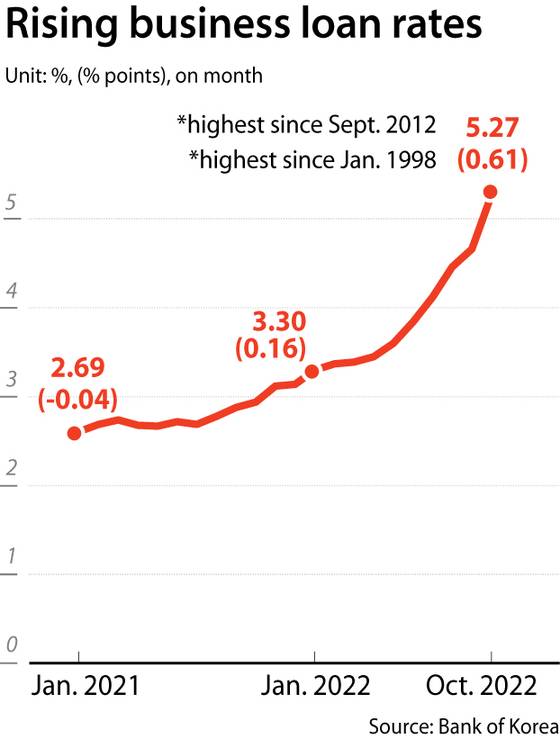 On average, the interest rate increased 0.61 percentage points on month to 5.27 percent last month, according to the Bank of Korea. This is the first time the figure has exceeded 5 percent since June 2012 and the fastest rise since Jan. 1998.