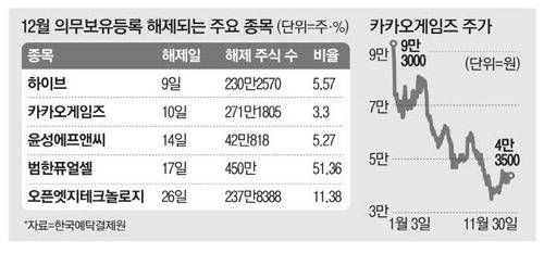 하이브·카겜 '매물폭탄 주의보'… 이달 59개 종목 의무보유 풀려
