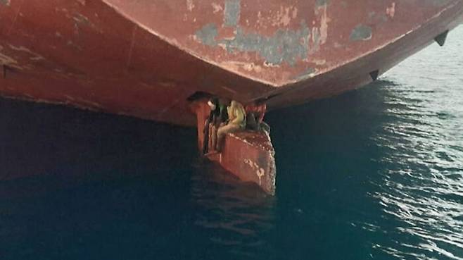스페인 해안경비대가 공개한 사진을 보면 밀항자들은 수면에서 1m 정도 떨어져 있는 유조선 방향타 위에 위태롭게 걸터앉아 있습니다.
