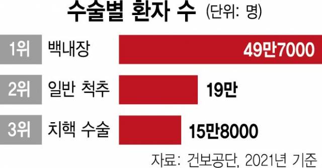 지난해에도 우리나라 국민이 가장 많이 받은 수술은 단연 백내장 수술이었다. 이어 일반 척추 수술, 치핵 수술을 받은 환자가 많았다. 백내장 수술의 경우 일부의 실손 보험금 빼먹기 수단으로의 악용, 일반 척추와 치핵 수술은 고령화와 잘못된 자세 등이 영향을 미친 것으로 분석된다.
