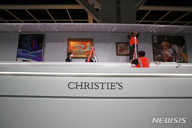[홍콩=뉴시스] 박진희 기자 = 크리스티 홍콩 관계자들이 30일 오후 예정인 '20·21세기 미술 이브닝 경매'를 위해 주요 작품을 디스플레이 하고 있다. 2022.11.30. pak7130@newsis.com