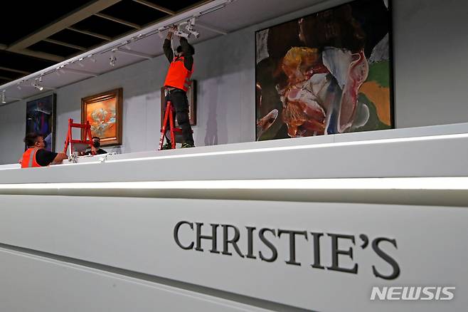[홍콩=뉴시스] 박진희 기자 = 크리스티 홍콩 관계자들이 30일 오후 예정인 '20·21세기 미술 이브닝 경매'를 위해 주요 작품을 디스플레이 하고 있다. 2022.11.30. pak7130@newsis.com