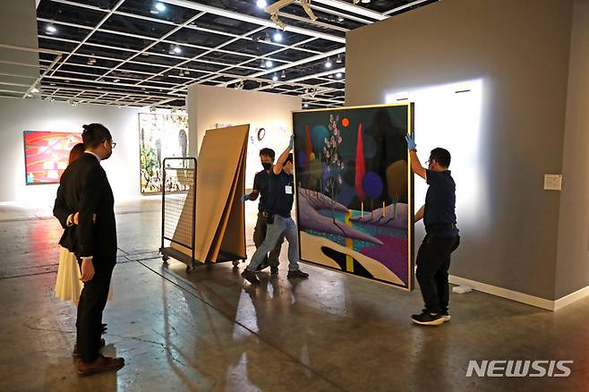 [홍콩=뉴시스] 박진희 기자 = 크리스티 홍콩 프리뷰 전시장인 홍콩 컨벤션 센터(HKCEC)에 전시중인 니콜라스 파티의 작품이 30일 오후 예정된 '20·21세기 미술 이브닝 경매' 장소으로 이동하고 있다. 2022.11.30. pak7130@newsis.com