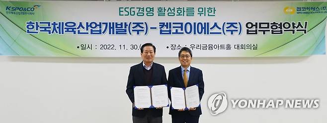 (서울=연합뉴스) 김사엽 한국체육산업개발 대표이사(왼쪽)가 30일 서울 송파구 우리금융아트홀에서 이준호 켑코이에스 대표이사와 'ESG 경영 활성화를 위한 에너지 효율화 사업 공동협력 업무협약(MOU)'을 체결 후 기념 촬영하고 있다. 2022.11.30 [한국체육산업개발 제공. 재판매 및 DB 금지]