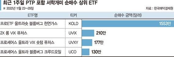 11월 30일 한국예탁결제원 증권정보포털 세이브로에 따르면 최근 1주일(29일 기준) 국내투자자의 해외주식 순매수 3위(1553만달러)는 프로쉐어즈 상장지수펀드(ETF) 울트라숏 블룸버그 천연가스(티커 KOLD)가 차지했다. 천연가스 선물가격을 반대로 2배 만큼 추종하는 종목이다. 전통적으로 서학개미들의 선호가 높다.