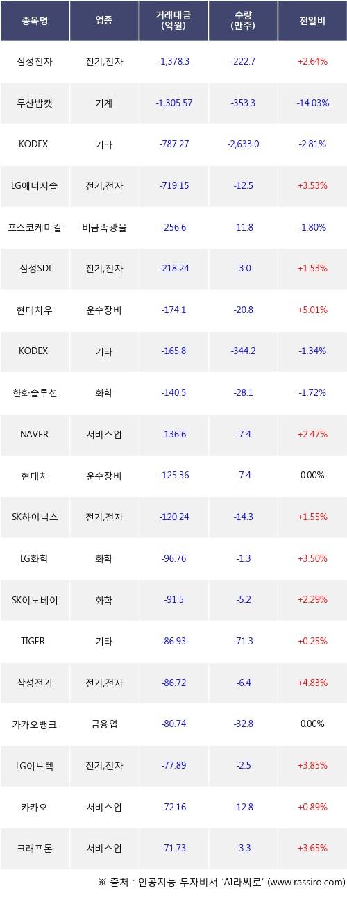 기관 투자자의 순매도 상위 20개 종목은 삼성전자, 두산밥캣, KODEX 200선물인버스2X, LG에너지솔루션, 포스코케미칼, 삼성SDI, 현대차우, KODEX 인버스, 한화솔루션, NAVER등이다.