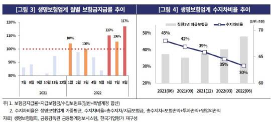 저축성 보험이 주요 상품인 생명보험사들의 해지환급금은 지난해 1~8월 17조7327억원에서 올 1~8월 20조2827억원으로 14.4% 증가했다. 생보사들은 저축성 보험의 금리를 연 5%대까지 올리며 자금 유치에 힘쓰고 있지만, 금리가 다시 낮아지면 역마진을 피할 수 없을 것이라는 우려가 나온다.