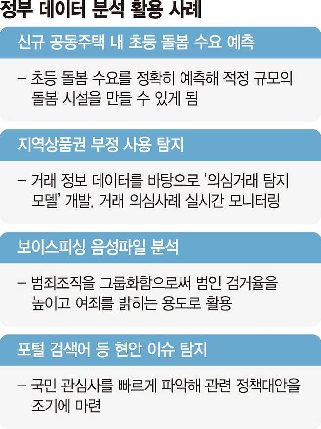 이외에도 행안부 데이터 분석은 보이스피싱범을 검거하거나 포털검색어 이슈를 탐지하는데 활용되는 등 다양한 분야에서 성과를 내고 있다.