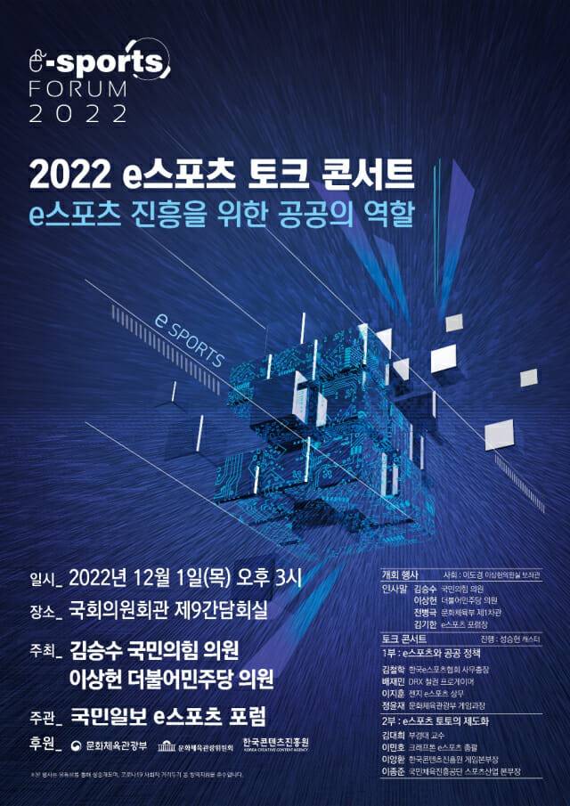 국민의힘 김승수 의원실은 더불어민주당 이상헌 의원실과 주최하는 '2022 e스포츠 토크 콘서트'가 오는 12월 1일 오후 3시 국회의원회관 9간담회실에서 개최된다고 밝혔다.