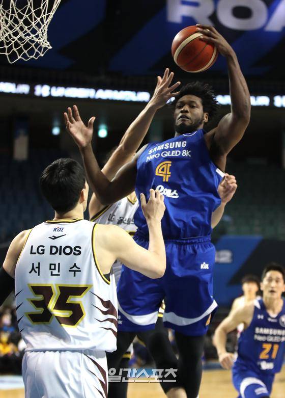 2022-2023 프로농구 서울삼성과 창원LG의 경기가 30일 오후 서울 잠실실내체육관에서 열렸다. 데릭슨이 수비 리바운드를 따내고 있다.