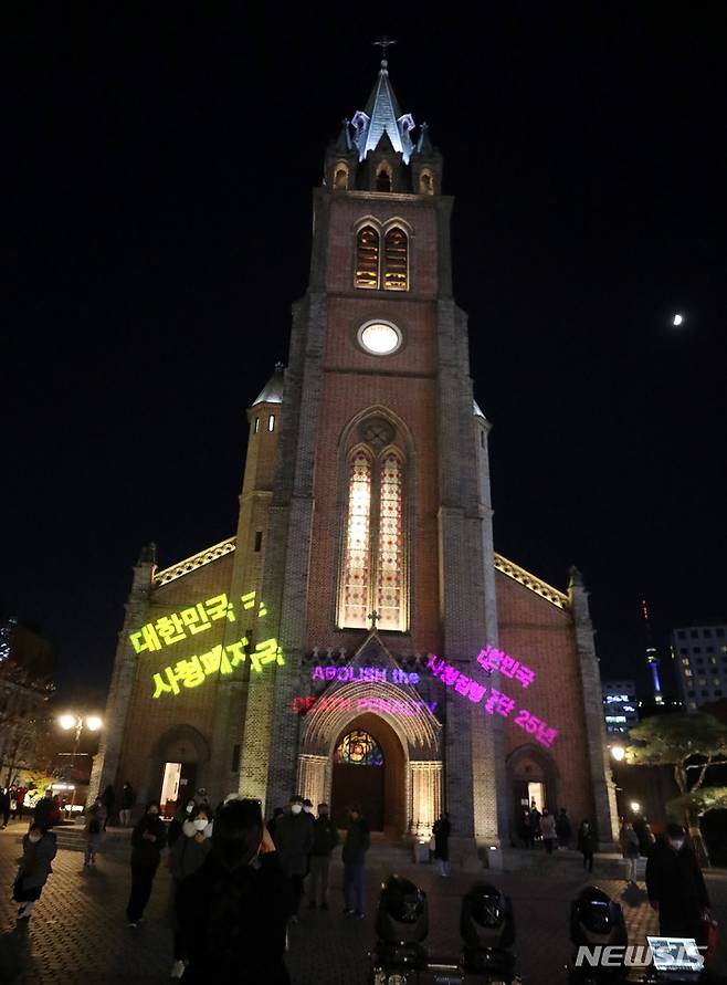 [서울=뉴시스] 추상철 기자 = 사형제도폐지 종교 인권 시민단체 연석회의가 30일 오후 서울 중구 명동대성당에서 세계 사형 반대의 날 20주년 기념 행사의 일환으로 '사형제도 폐지 빔버타이징' 조명 퍼포먼스를 펼치고 있다. 2022.11.30. scchoo@newsis.com