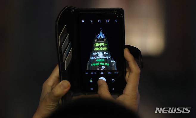 [서울=뉴시스] 추상철 기자 = 30일 오후 서울 중구 명동대성당에서 열린 세계 사형 반대의 날 20주년 기념 행사에서 수녀가 '사형제도 폐지 빔버타이징' 조명 퍼포먼스를 사진으로 담고 있다. 2022.11.30. scchoo@newsis.com