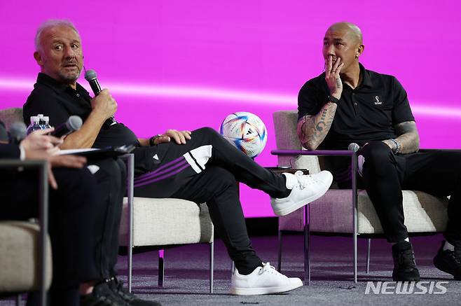 [알라이얀(카타르)=뉴시스] 백동현 기자 = 알베르토 자케로니(왼쪽) 전 일본 축구대표팀 감독이 30일(현지시간) 오전 카타르 메인미디어센터(MMC)에서 열린 국제축구연맹(FIFA) 기술 연구 그룹(TSG) 브리핑에서 발언하고 있다. TSG는 월드컵 경기를 분석하고 보고서를 만들어 대회 최우수 선수와 개인 수상자 선정 등에 관여하는 일을 한다. 2022.11.30. livertrent@newsis.com