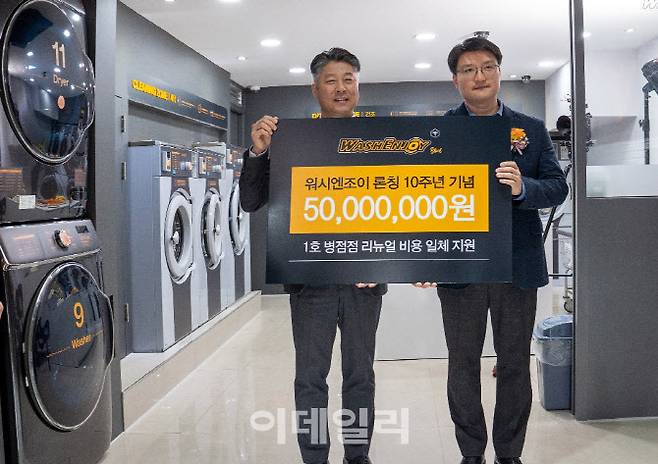 [이데일리 김태형 기자] 세탁 솔루션 전문기업 코리아런드리 서경노(왼쪽) 대표이사가 30일 화성병점 점주에게 리뉴얼 비용 5천만원을 전달하고 있다.