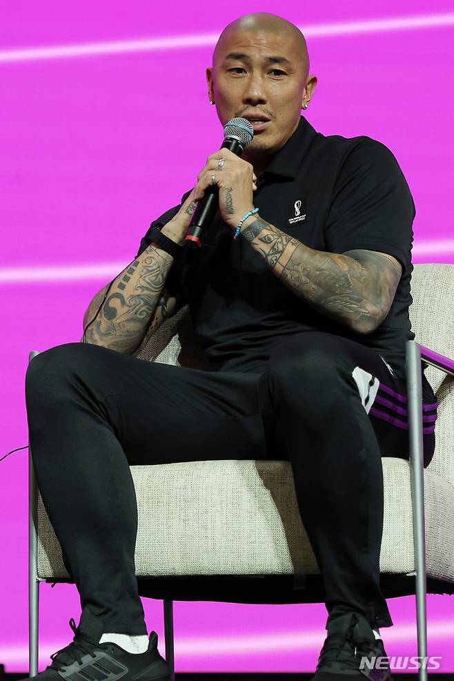 [알라이얀(카타르)=뉴시스] 백동현 기자 = 차두리가 30일(현지시간) 오전 카타르 메인미디어센터(MMC)에서 열린 국제축구연맹(FIFA) 기술 연구 그룹(TSG) 브리핑에서 발언하고 있다. TSG는 월드컵 경기를 분석하고 보고서를 만들어 대회 최우수 선수와 개인 수상자 선정 등에 관여하는 일을 한다. 2022.11.30. livertrent@newsis.com