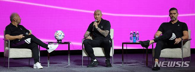 [알라이얀(카타르)=뉴시스] 백동현 기자 = 차두리(가운데)가 30일(현지시간) 오전 카타르 메인미디어센터(MMC)에서 열린 국제축구연맹(FIFA) 기술 연구 그룹(TSG) 브리핑에서 발언하고 있다. TSG는 월드컵 경기를 분석하고 보고서를 만들어 대회 최우수 선수와 개인 수상자 선정 등에 관여하는 일을 한다. 2022.11.30. livertrent@newsis.com