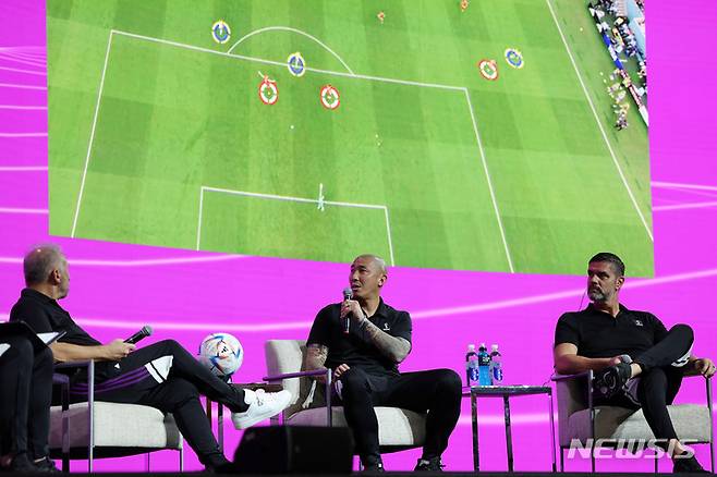 [알라이얀(카타르)=뉴시스] 백동현 기자 = 차두리(가운데)가 30일(현지시간) 오전 카타르 메인미디어센터(MMC)에서 열린 국제축구연맹(FIFA) 기술 연구 그룹(TSG) 브리핑에서 발언하고 있다. TSG는 월드컵 경기를 분석하고 보고서를 만들어 대회 최우수 선수와 개인 수상자 선정 등에 관여하는 일을 한다. 2022.11.30. livertrent@newsis.com