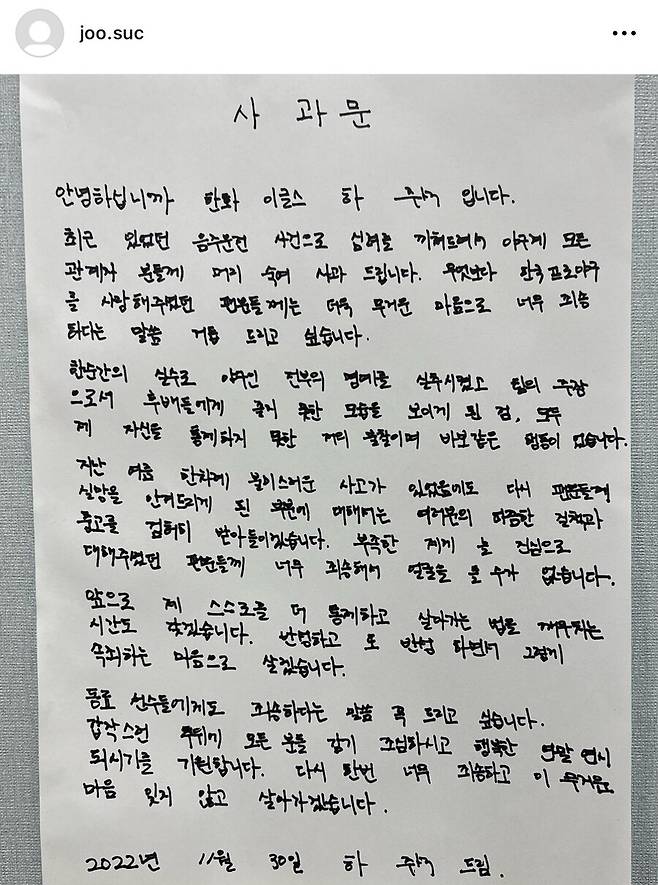 하주석은 30일 인스타그램에 음주운전 사건으로 야구계와 팬들에게 심려를 끼쳐 죄송하다며 사과하는 글을 남겼다. 20일 음주운전 사실이 알려진 뒤 열흘 만의 일이다.