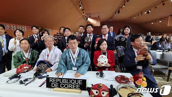 (서울=뉴스1) 임세영 기자 = 30일(현지시각) 모로코 라바타에서 열린 제17차 유네스코 무형유산보호협약 정부간위원회에서 ‘한국의 탈춤’이 유네스코 인류무형문화유산으로 등재되자 최응천 문화재청장(가운데)이 위원국들에게 감사연설을 하고 있다. ‘한국의 탈춤’은 춤과 노래, 연극을 아우르는 종합예술로, 사회 비판과 평등의 가치를 인정받아 한국의 22번째 유네스코 인류무형문화유산으로 이름을 올리게 되었다. (문화재청 제공) 2022.11.30/뉴스1