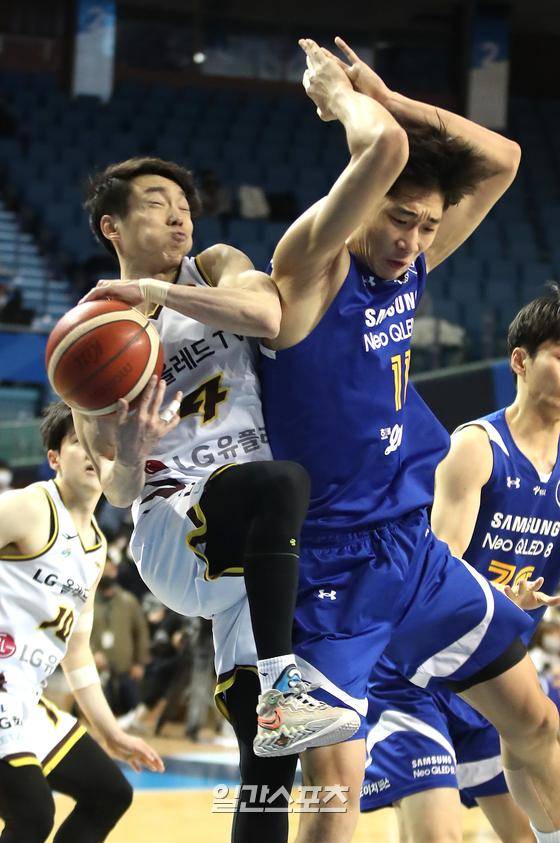 2022-2023 프로농구 서울삼성과 창원LG의 경기가 30일 오후 서울 잠실실내체육관에서 열렸다. 이재도가 리바운드를 잡다 이원석에게 밀리고 있다.