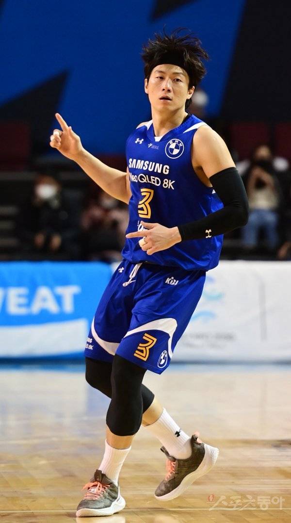 30일 서울 잠실실내체육관에서 열린 ‘2022-2023 SKT 에이닷 프로농구’ 서울 삼성과 창원 LG의 경기에서 삼성 이정현이 3점슛을 성공시킨 후 손짓하고 있다.
