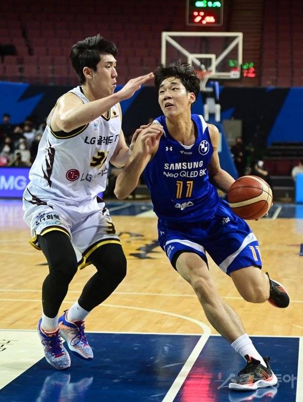 30일 서울 잠실실내체육관에서 열린 ‘2022-2023 SKT 에이닷 프로농구’ 서울 삼성과 창원 LG의 경기에서 삼성 이원석이 LG 김준일의 수비를 뚫고 드리블 돌파하고 있다.