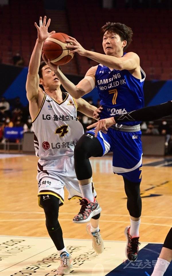 30일 서울 잠실실내체육관에서 열린 ‘2022-2023 SKT 에이닷 프로농구’ 서울 삼성과 창원 LG의 경기에서 삼성 김현수가 LG 이재도의 수비를 뚫고 슛을 하고 있다.