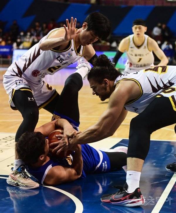 30일 서울 잠실실내체육관에서 열린 ‘2022-2023 SKT 에이닷 프로농구’ 서울 삼성과 창원 LG의 경기에서 LG 마레이가 삼성 조우성의 볼을 빼앗고 있다.