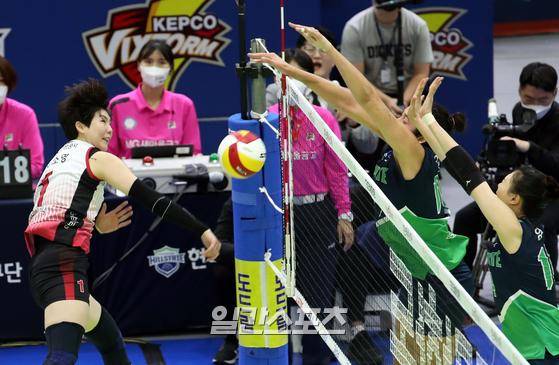 도드람 2022-2023 V리그 여자부 현대건설과 KGC인삼공사가 30일 오후 수원실내체육관에서 맞대결을 펼쳤다. KGC인삼공사 이소영이 현대건설 블로킹을 피해 강타를 날리고있다.
