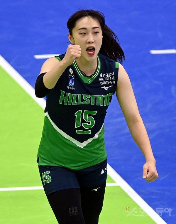 30일 경기도 수원체육관에서 ‘2022-2023 도드람 V리그’ 수원 현대건설과 대전 KGC인삼공사의 여자부 경기가 열렸다. 현대건설 황민경이 득점을 올린 후 환호하고 있다.