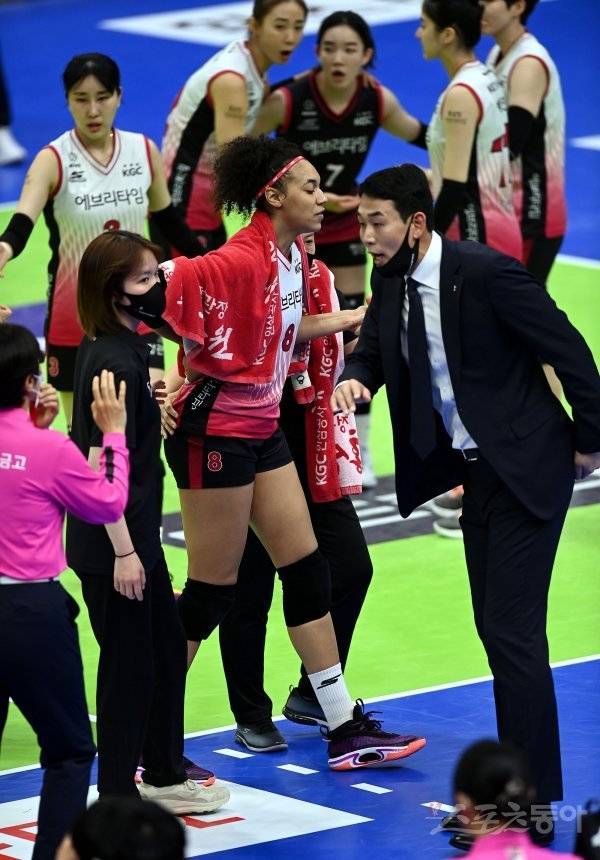 30일 경기도 수원체육관에서 ‘2022-2023 도드람 V리그’ 수원 현대건설과 대전 KGC인삼공사의 여자부 경기가 열렸다. KGC인삼공사 엘리자벳이 부상으로 코트를 벗어나고 있다.