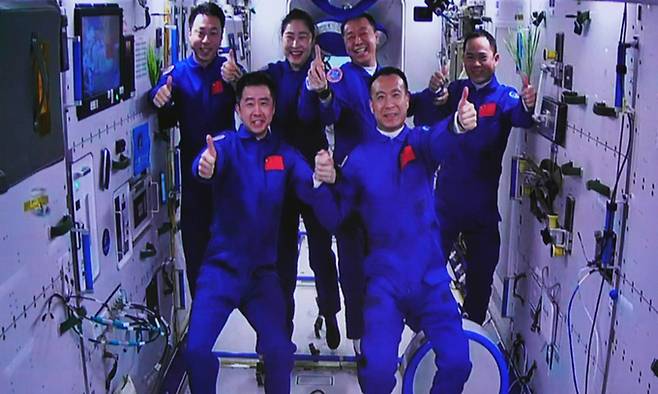 | 임무교대하는 中 우주인 6명 중국 최초이자 인류 세 번째 우주정거장이 될 톈궁 우주정거장에서 30일 선저우 14, 15호 우주인 6명이 만나 엄지손가락을 치켜들고 기념촬영하고 있다. 29일 발사된 선저우 15호 우주인 3명은 엿새 정도 후 6월 발사된 선저우 14호 우주인 3명과 교대해 6개월 동안 톈궁 우주정거장에 머물며 우주정거장 본격 가동을 위한 준비와 실험 등 각종 임무를 수행할 예정이다. 신화뉴시스 |