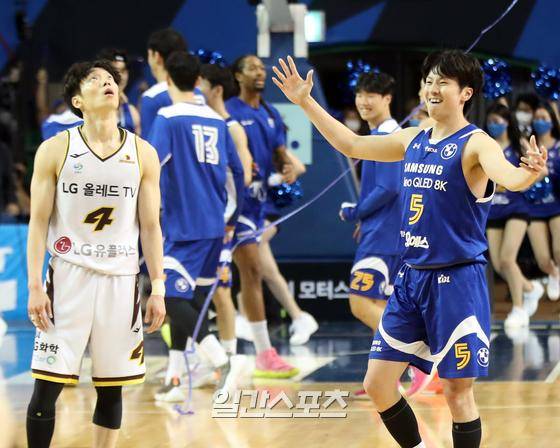 2022-2023 프로농구 서울삼성과 창원LG의 경기가 30일 오후 서울 잠실실내체육관에서 열렸다. 75대 70으로 LG를 꺾고 승리한 삼성 김시래가 이재도 옆에서 기뻐하고 있다.