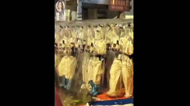방역복 차림의 경찰은 투명한 방패로 방어 대형을 만들더니 이내 최루탄을 쏘며 진압에 나섰고, 시위대들을 줄줄이 연행했습니다.