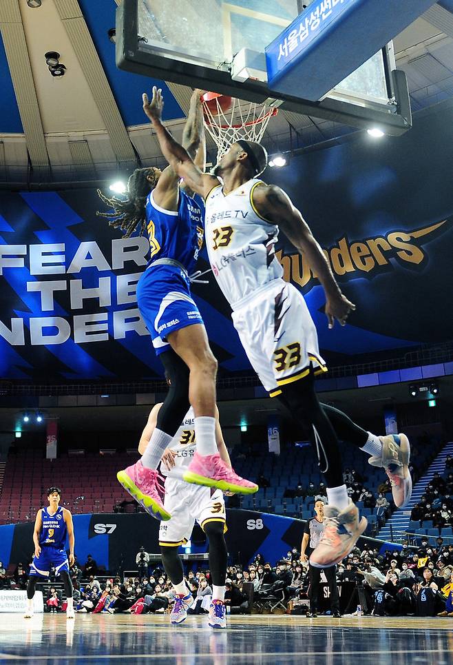 [서울=뉴시스] 추상철 기자 = 30일 서울 송파구 잠실실내체육관에서 열린 2022-2023 SKT 에이닷 프로농구 서울 삼성과 창원 LG의 경기, 삼성 이매뉴얼 테리가 덩크 슛을 하고 있다. (사진= KBL 제공) 2022.11.30. photo@newsis.com *재판매 및 DB 금지