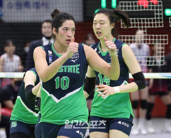 도드람 2022-2023 V리그 여자부 현대건설과 KGC인삼공사가 30일 오후 수원실내체육관에서 맞대결을 펼쳤다. 현대건설 야스민이 득점 후 엄지척 하고있다.
