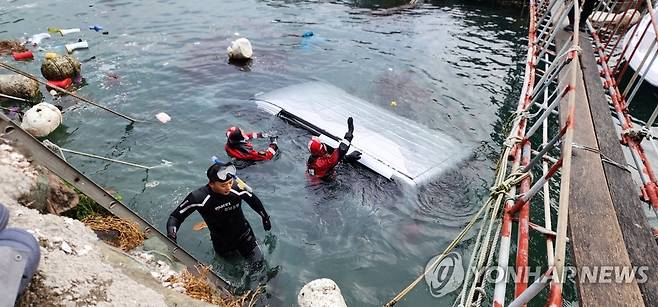 (통영=연합뉴스) 30일 오후 3시 59분께 경남 통영시 인평동 한 방파제 부근에서 스타렉스 승합차가 바다에 추락해 해경이 현장을 살피고 있다.