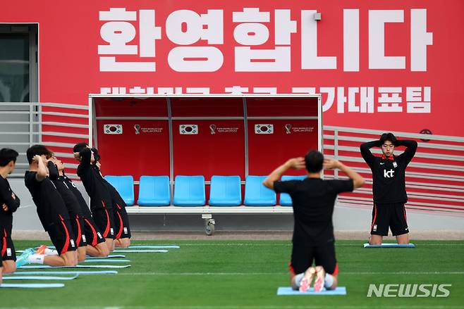 [도하(카타르)=뉴시스] 백동현 기자 = 대한민국 축구대표팀 선수들이 30일(현지시간) 오후 카타르 도하 알 에글라 트레이닝센터에서 훈련하고 있다. 2022.11.30. livertrent@newsis.com