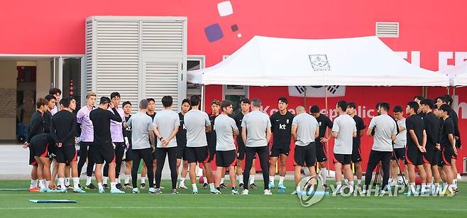 (도하=연합뉴스) 김도훈 기자 = 30일(현지시간) 카타르 도하 알에글라 훈련장에서 2022 카타르 월드컵 조별리그 3차전 포르투갈과의 경기를 앞둔 한국 대표팀 선수들이 훈련 전 파울루 벤투 감독과 코치진의 이야기를 듣고 있다. 2022.11.30