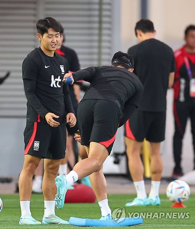 (도하=연합뉴스) 김도훈 기자 = 30일(현지시간) 카타르 도하 알에글라 훈련장에서 2022 카타르 월드컵 조별리그 3차전 포르투갈과의 경기를 앞둔 한국 대표팀 이강인과 손흥민이 밸런싱 훈련을 하고 있다. 2022.11.30