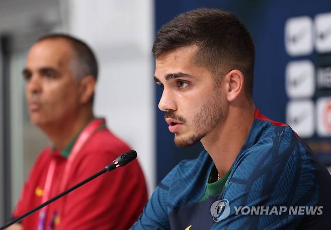(도하=연합뉴스) 임헌정 기자 = 2022 카타르 월드컵 조별리그 3차전 상대인 포르투갈 축구 대표팀의 안드레 실바가 30일 오후(한국시간) 카타르 도하 외곽의 알샤하니야 훈련장에서 훈련에 앞서 취재진 질문에 답하고 있다. 2022.11.30