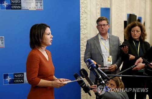 epa10338804 Germany's Foreign Minister Annalena Baerbock (L) speaks during a press conference at the end of the NATO Foreign Ministers Meeting held at Parliament Palace in Bucharest, Romania, 30 November 2022. Foreign Ministers from NATO countries gathered in Romania's capital on 29 and 30 November 2022 to tackle Russia?s invasion in Ukraine, NATO?s support for Kyiv administration and regional partners and to find new ways to strengthen the Eastern flank of the alliance. EPA/ROBERT GHEMENT