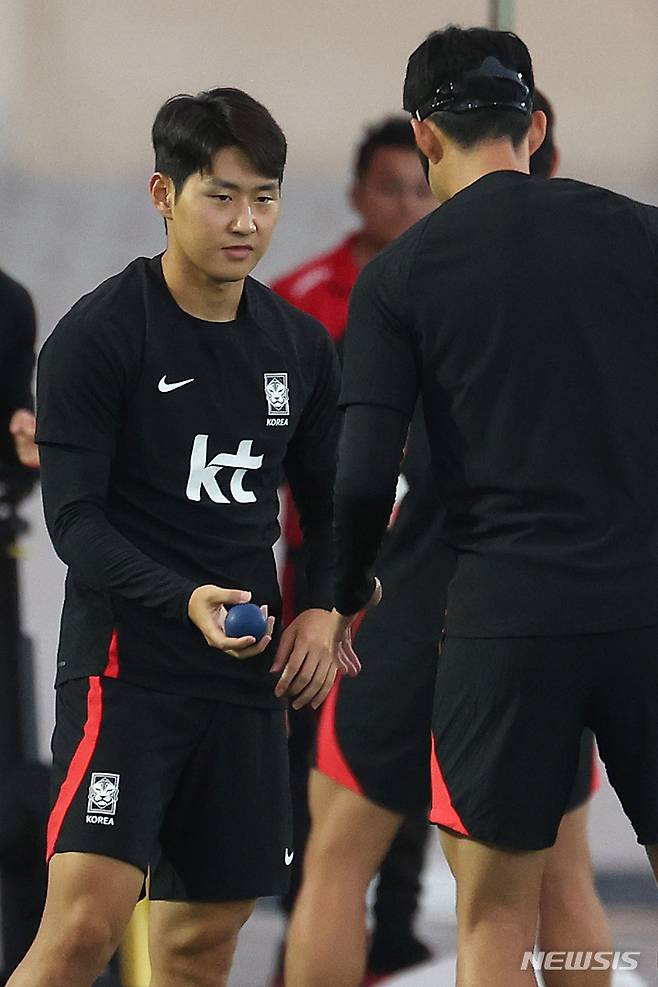 [도하(카타르)=뉴시스] 백동현 기자 = 이강인이 30일(현지시간) 오후 카타르 도하 알 에글라에 마련된 대한민국 축구대표팀 트레이닝센터에서 손흥민과 함께 훈련하고 있다. 2022.11.30. livertrent@newsis.com