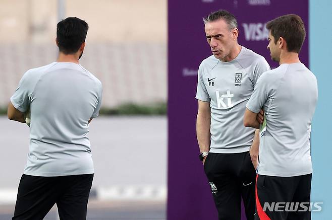 [도하(카타르)=뉴시스] 백동현 기자 = 파울루 벤투 감독이 30일(현지시간) 오후 카타르 도하 알 에글라에 마련된 대한민국 축구대표팀 트레이닝센터에서 훈련을 지켜보며 코치진과 대화하고 있다. 2022.11.30. livertrent@newsis.com