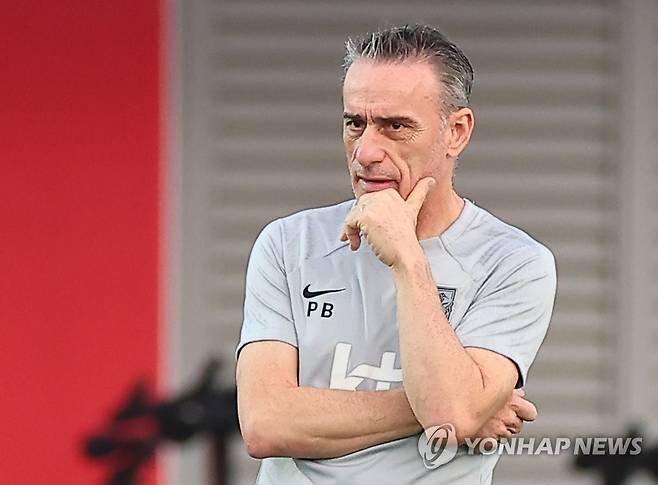 (도하=연합뉴스) 김도훈 기자 = 30일(현지시간) 카타르 도하 알에글라 훈련장에서 2022 카타르 월드컵 조별리그 3차전 포르투갈과의 경기를 앞둔 한국 대표팀 파울루 벤투 감독이 생각에 잠겨 있다. 2022.11.30